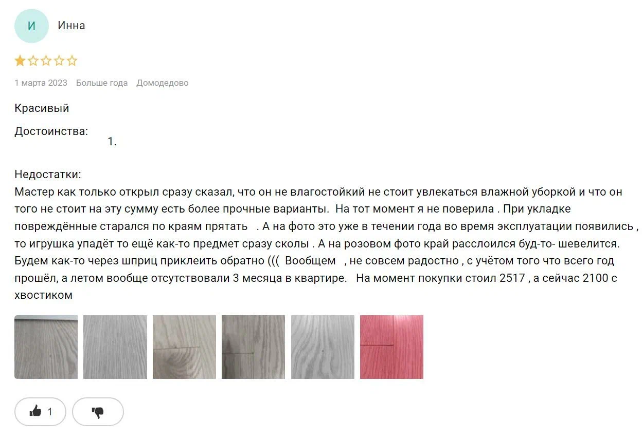 «Мастер как только открыл сразу сказал, что он не влагостойкий не стоит увлекаться влажной уборкой и что он того не стоит на эту сумму есть более прочные варианты».